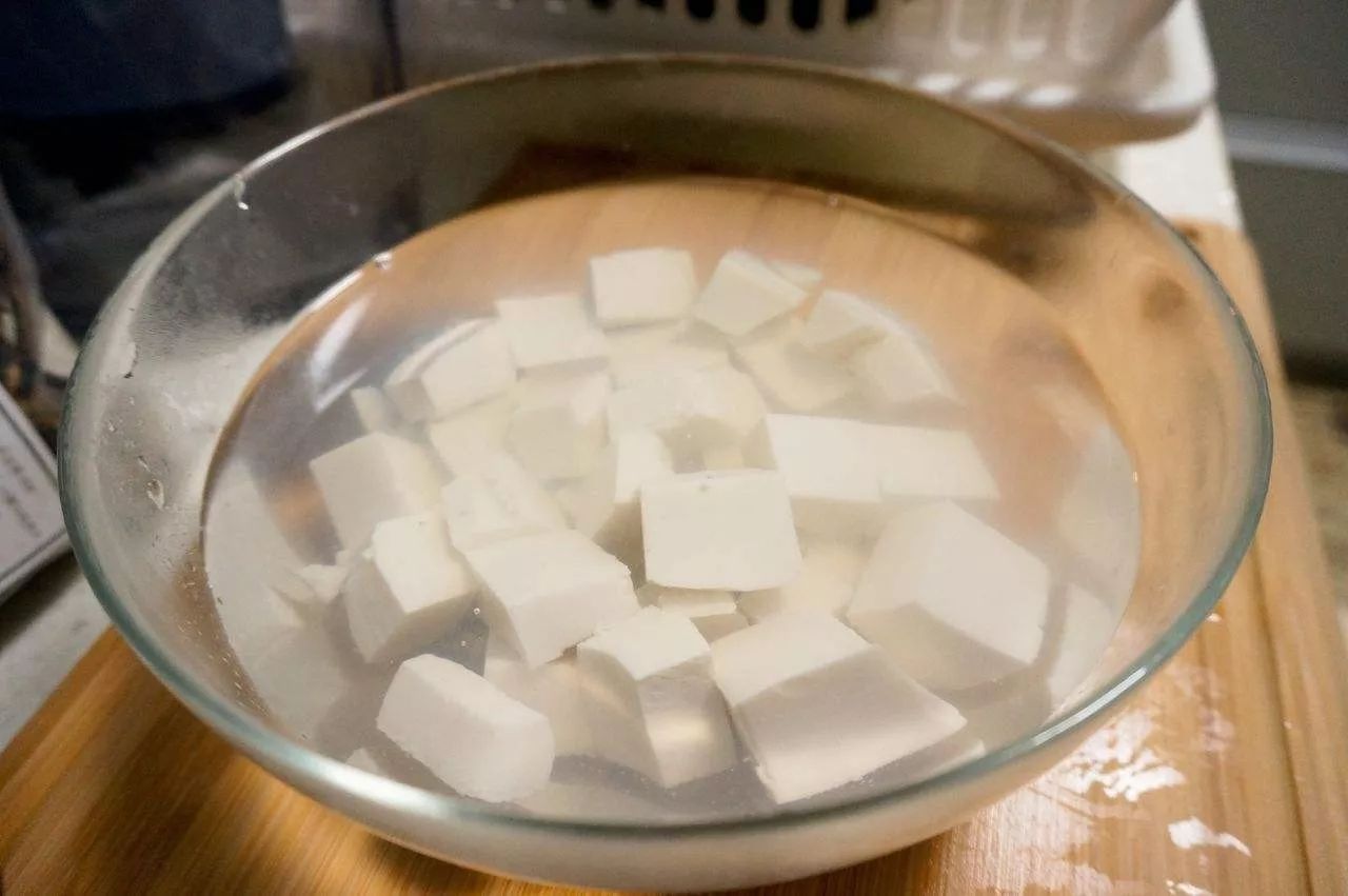 7、把豆腐切成块儿状后,放入淡盐水中浸泡3至5分钟,就可去除豆腐的豆腥味儿。